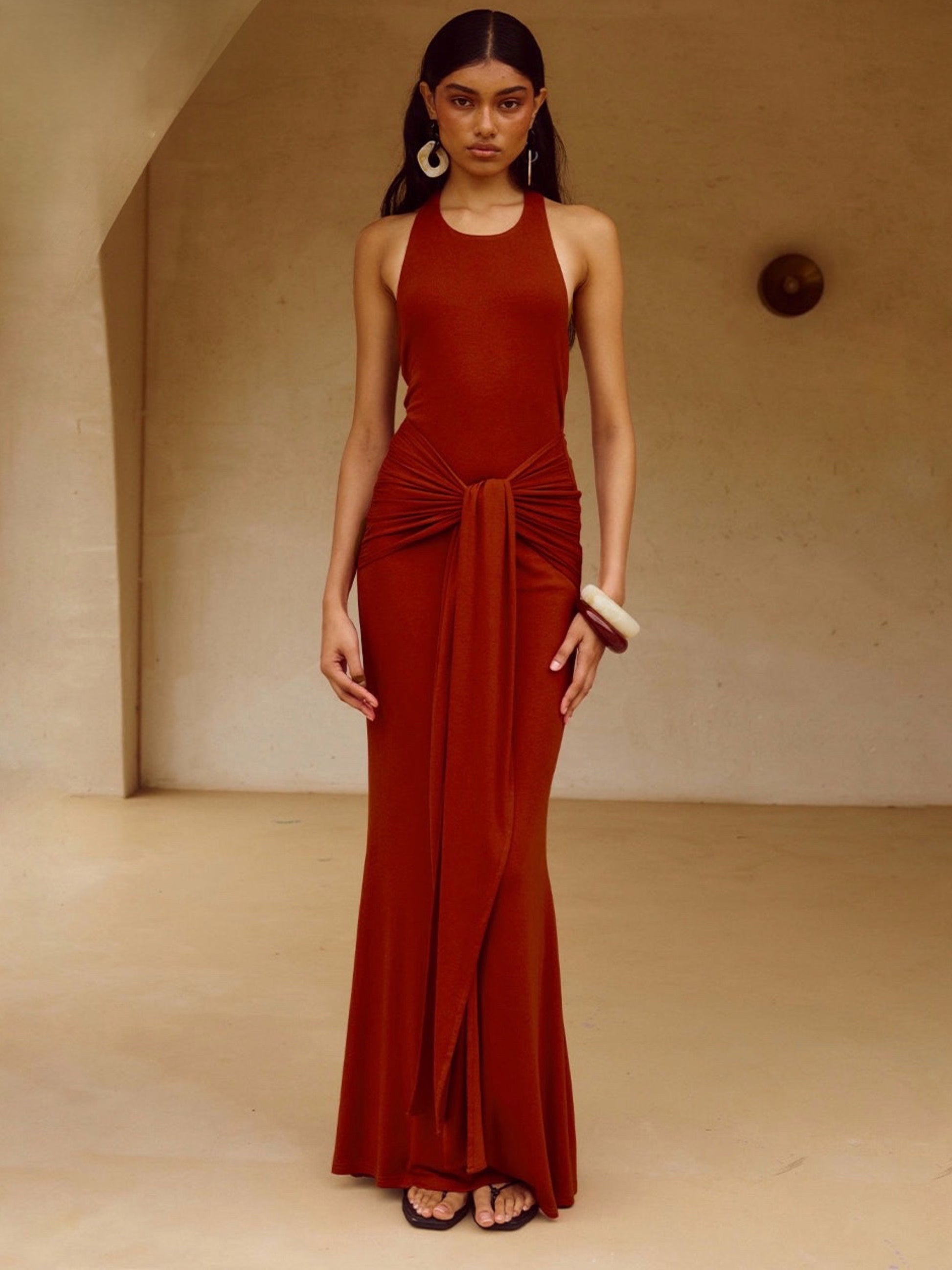 Elegant and sexy, with a hip tie and open back for a sultry silhouette our Judah Maxi Dress is perfect for a late night dinner.
