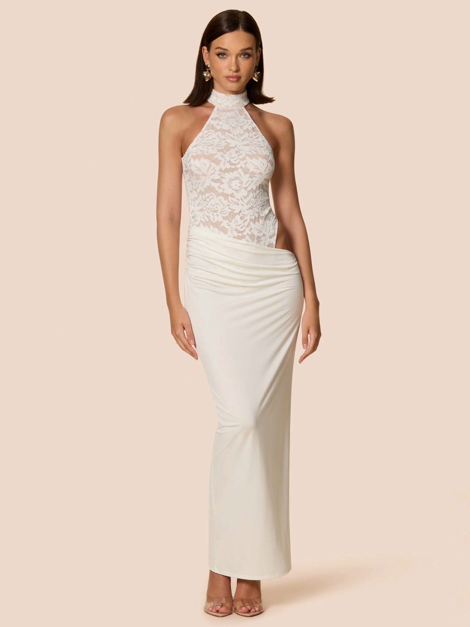 Incredible halter gown, with a sheer lace bodysuit and slinky jersey skirt drape from one side. Exposed hip. Invisible zip at back and snap closure at pant. Bodysuit is lined.